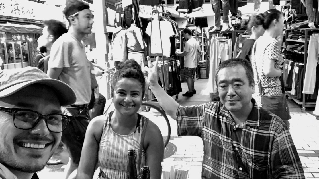I take a sip of my beer. He turns to his left, speaking in Japanese to an old man with one tooth. His face is completely red, but he’s been avidly listening to our conversation. I hear “London” and “Double oh Seven.” The man with one tooth laughs and gives us the thumbs up.